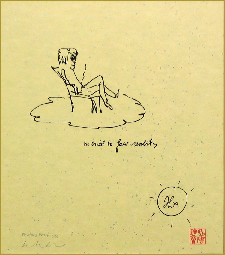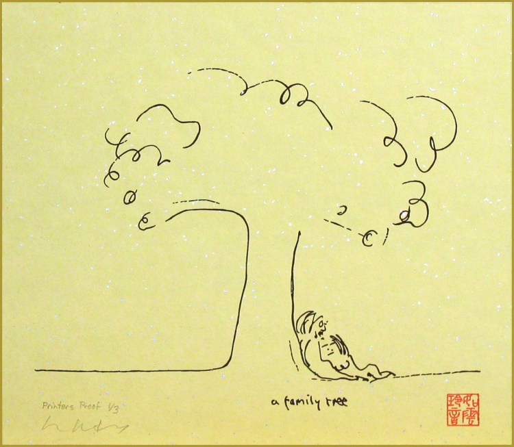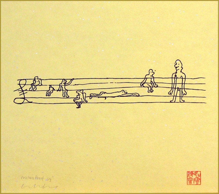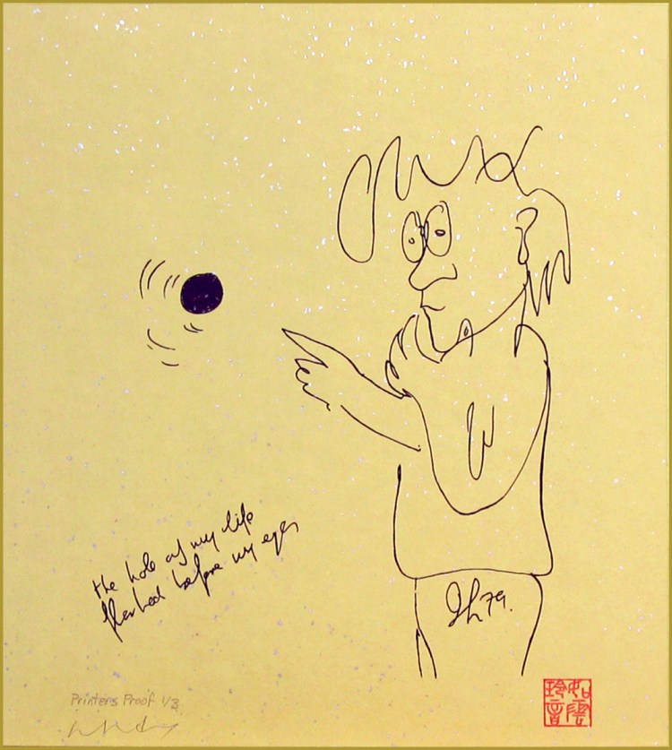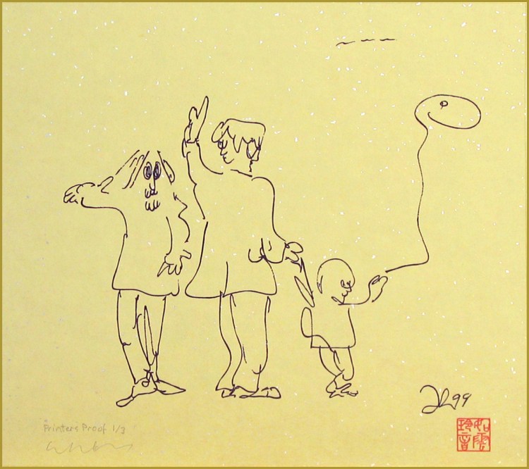 Japanese papers and many paper creations are world renown. Shikishi Boards have one side with a golden paper surface with sparkle effects and gold trim. Bag One saw this as a great background for some of John’s drawings.