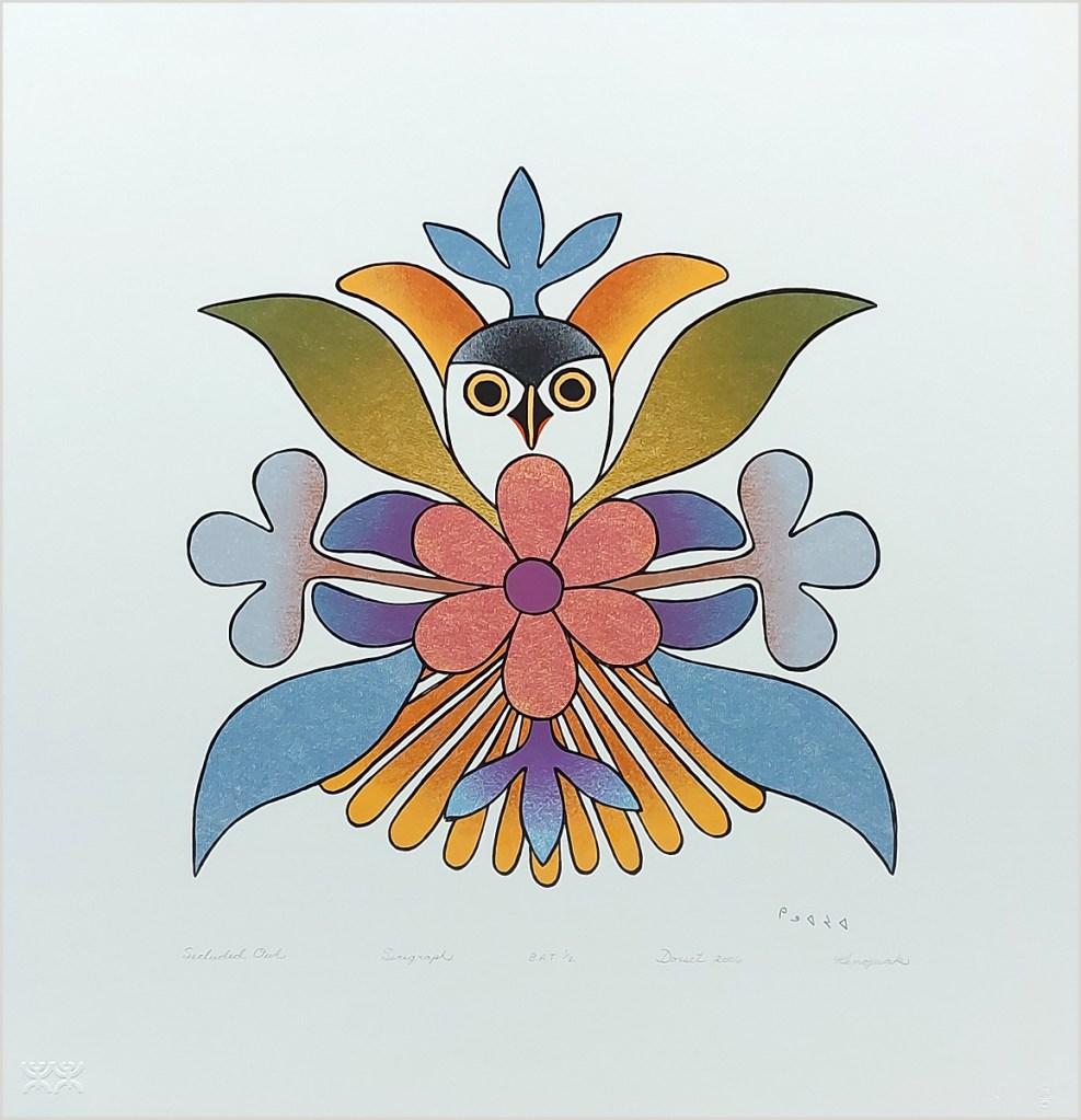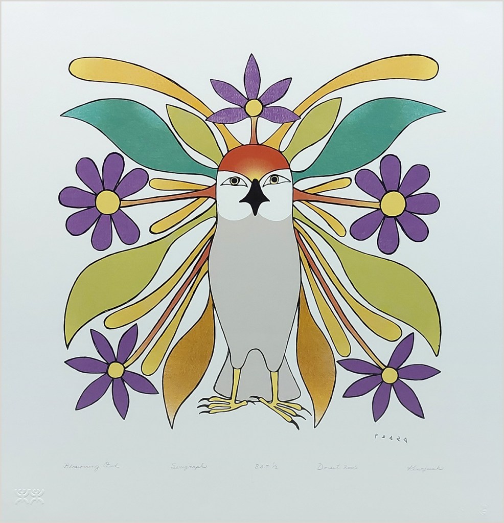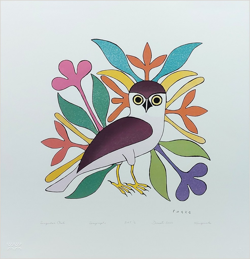It was our pleasure to work for Dorset Fine Arts who published these prints by following Inuit artists from Kinngait (Cape Dorset), Baffin Island between 2006 and 2009. Kinngait has their own printmaking studio but they did not use silkscreen at the time which we could do for them. Working with these artists’ ideas taught us a little about the Inuit culture as well. Inquiries: Gallery House.