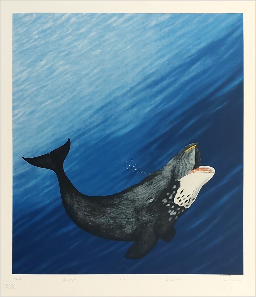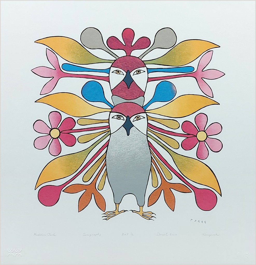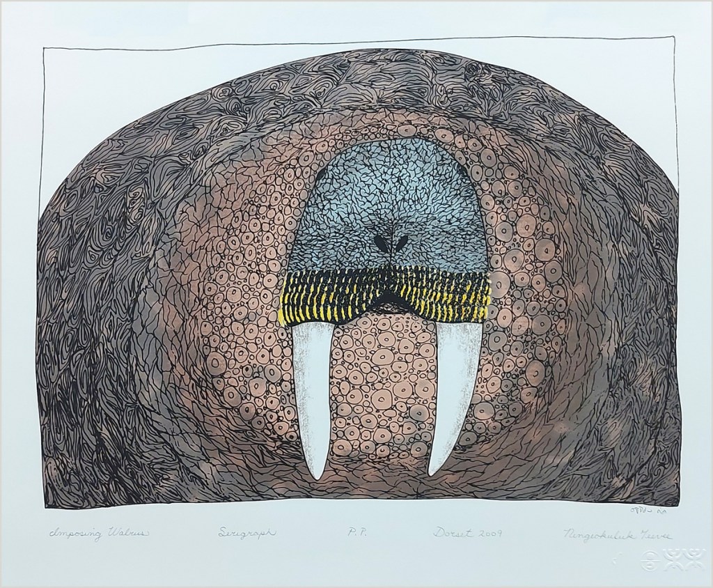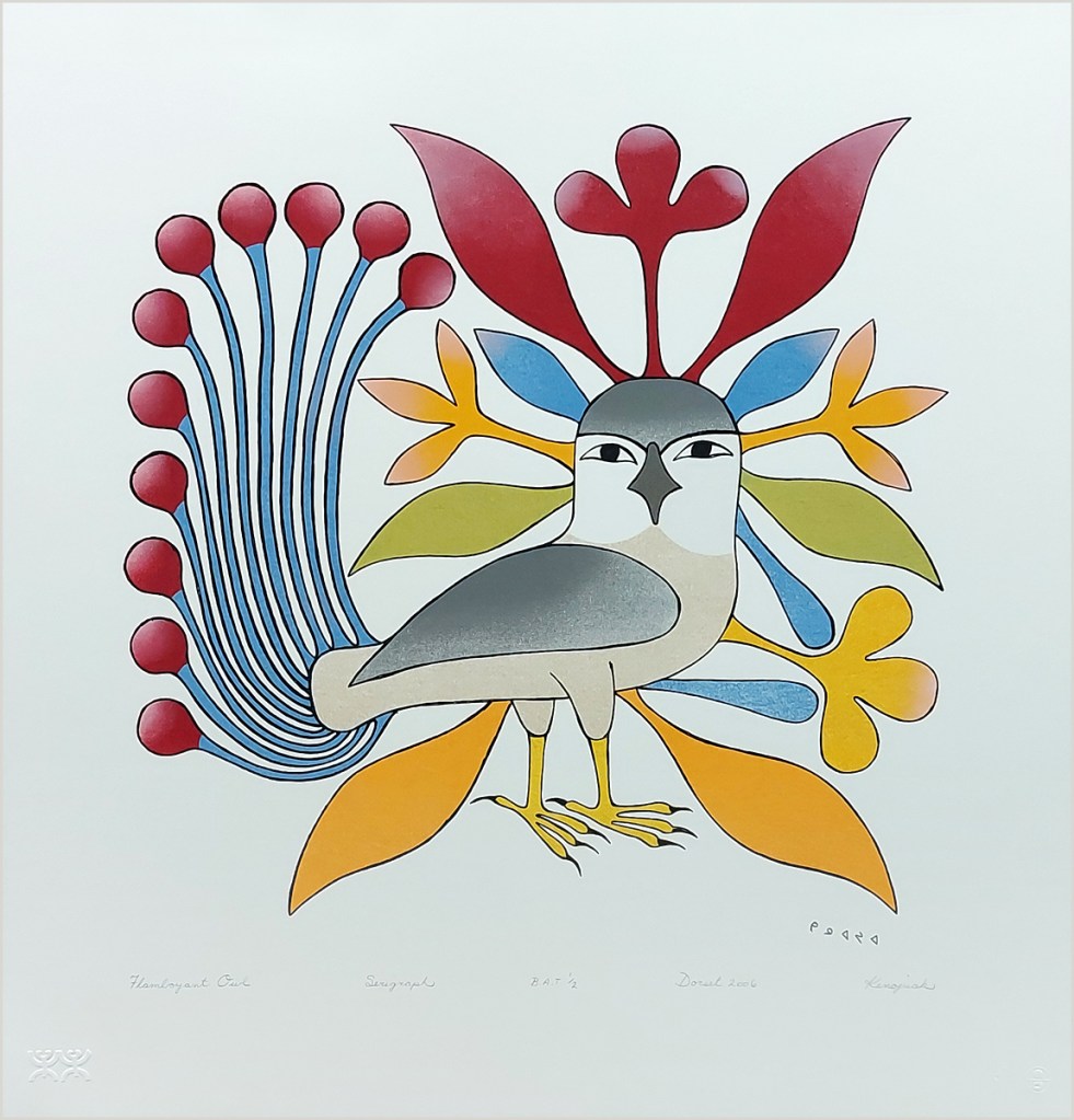 It was our pleasure to work for Dorset Fine Arts who published these prints by following Inuit artists from Kinngait (Cape Dorset), Baffin Island between 2006 and 2009. Kinngait has their own printmaking studio but they did not use silkscreen at the time which we could do for them. Working with these artists’ ideas taught us a little about the Inuit culture as well. Inquiries: Gallery House.