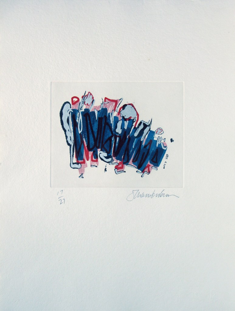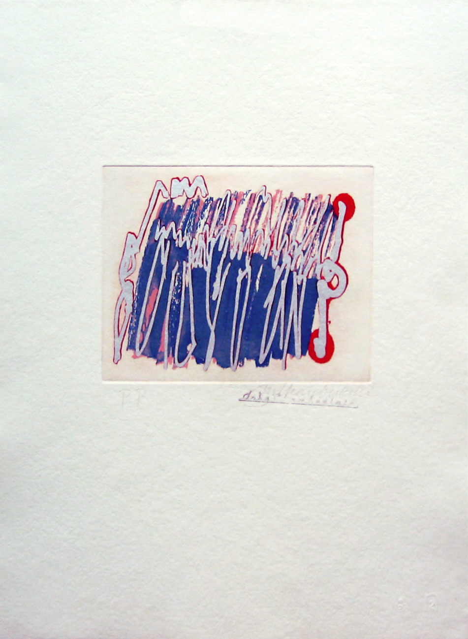 This suite is printed on handmade paper from La Papeterie St Armand of Montreal. The soft puffy texture of the paper surface is a great surround for these colour etchings with silkscreen printed silver touches and light plate tone backgrounds. The suite was printed in an edition of 27 in 1986.